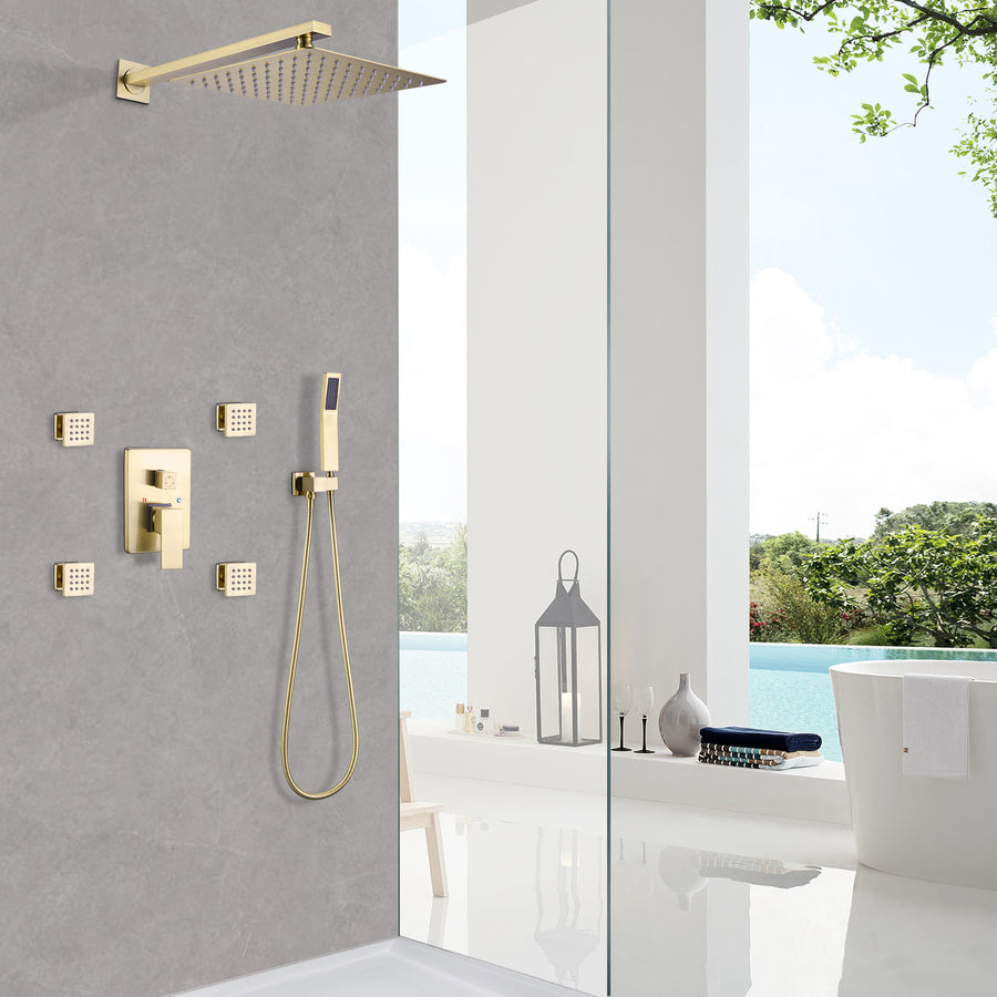 Innovative Design Elements: Discuss the cutting-edge designs in brushed gold shower systems, including waterfall showerheads, handheld wands, and body jets.