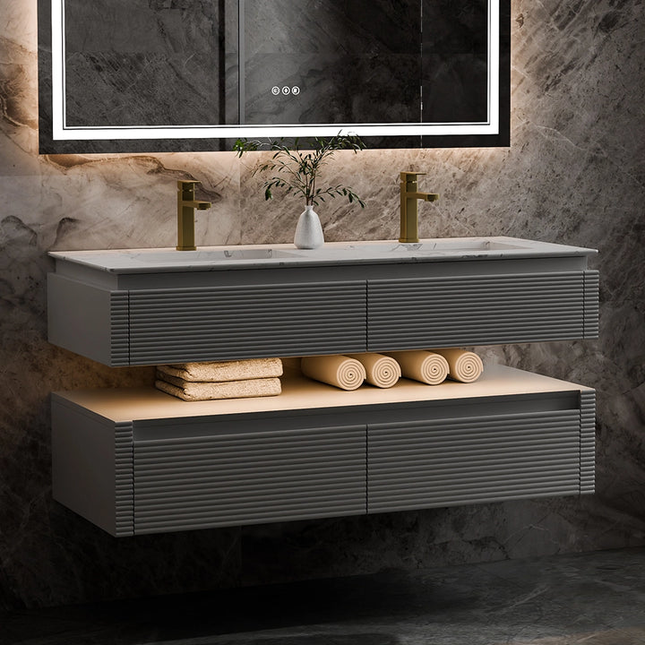 Upgrade your bathroom with this 48" modern wall-mounted vanity, combining refined style with everyday practicality. The premium engineered stone countertop pairs with two CUPC-certified undermount sinks for a clean, high-end look built to last. Soft-close drawers offer smooth, quiet storage, while a sleek faux drawer front hides the sink structure to maintain a streamlined, contemporary design. Crafted from solid oak and moisture-resistant plywood, this vanity delivers exceptional durability in humid environments. Its layered silhouette adds visual depth, and the built-in LED night light provides soft, ambient illumination for nighttime convenience. Available in glossy white or deep green, it comes with pre-drilled faucet holes, integrated overflow, and a hassle-free installation setup—making it an ideal upgrade for modern bathrooms seeking both function and style.