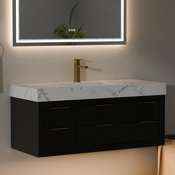 Bring sophisticated charm and modern convenience to your bathroom with this 48-inch floating vanity. Designed for those who appreciate high-end finishes and functional elegance, this wall-mounted vanity features a striking finish accented by sleek rose gold handles, setting the tone for a refined and stylish bathroom space. Crafted from durable solid oak and plywood, the vanity is built to last in humid bathroom environments. Available in stunning finishes, this vanity adapts seamlessly to your design vision. Choose for a minimalist, spa-like atmosphere, with rose gold hardware to bring warmth and contemporary flair to your space. All finishes are treated for water and scratch resistance, ensuring long-lasting beauty in any bathroom setting. Function meets comfort with six soft-close drawers, built with pine wood and equipped with advanced auto-buffering glides to ensure smooth, silent operation. Built-in LED lighting at the base adds ambient illumination, acting as a soft night light and enhancing your bathroom atmosphere with a warm glow.
